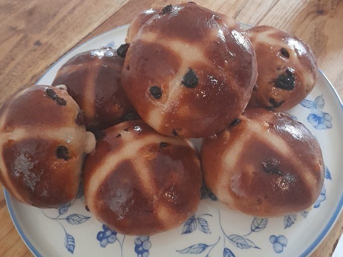 Place the buns into the pre-heated oven and reduce the heat to 200c/400f/gas 6 and bake for 15-20 minutes until golden brown and sound hollow when tapped. Brush with the jam/marmalade melted with a little water to give each one a nice sweet shine. Transfer to a wire rack to cool. Eat cold or warm with plenty of butter.
