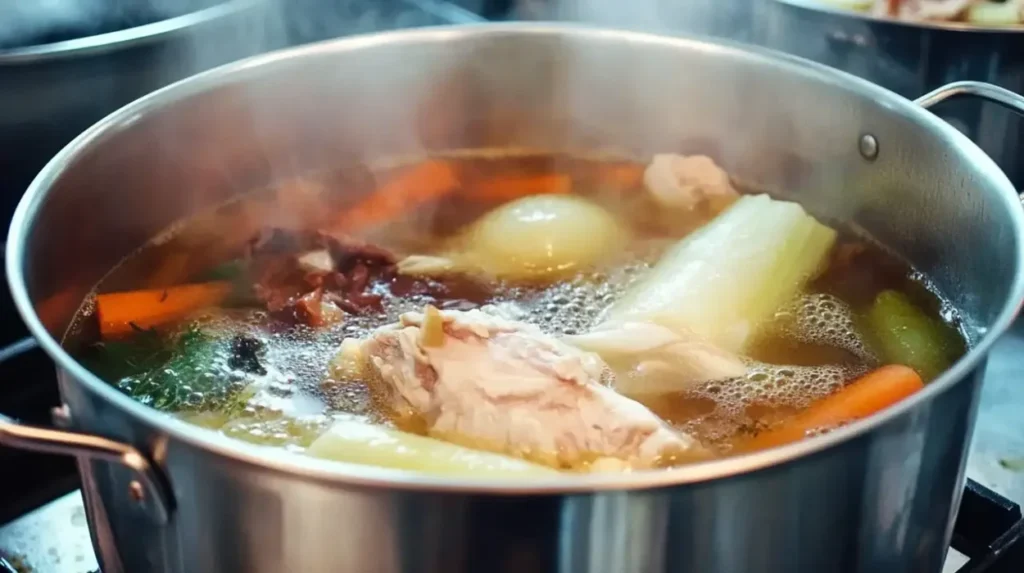 When making veal stock knuckle and marrow bones are the best ones to use, when making larger quantities then use veal trotters rather than pigs trotters. If veal bones aare not available then use beef bones, these are not as fine or clean in flavour as veal nor do they contain as much gelatine either but they are an acceptable substitute.